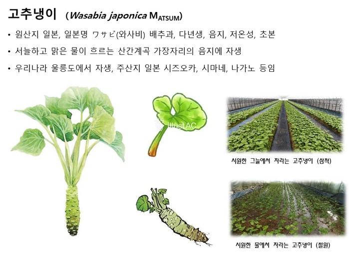 고추냉이는 ‘와사비’로 알려진 식물로 가격은 kg당 쌈채소용 잎은 1~2만원, 근경은 10~20만원에 거래되는 고가의 작물로 국내산은 대부분 강원도에서 생산되고 있다.