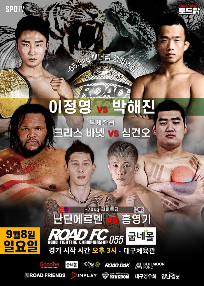 굽네몰 ROAD FC 055의 경기는 총 6경기로 12명의 출전 선수들이 확정됐다. 앞서 소개한 메인 이벤트 외에 화려한 태권도 발차기를 보여주는 크리스 바넷과 주먹이 운다 출신의 ‘괴물 레슬러’ 심건오가 대결하고, ‘몽골 복싱 국대’ 난딘에르덴과 ‘태권도 국대 상비군 출신’의 홍영기도 출격한다. 대구 출신의 파이터들도 대거 출격, 대구에서 프로 MMA 대회를 기다려온 팬들의 갈증을 해소해줄 예정이다.
