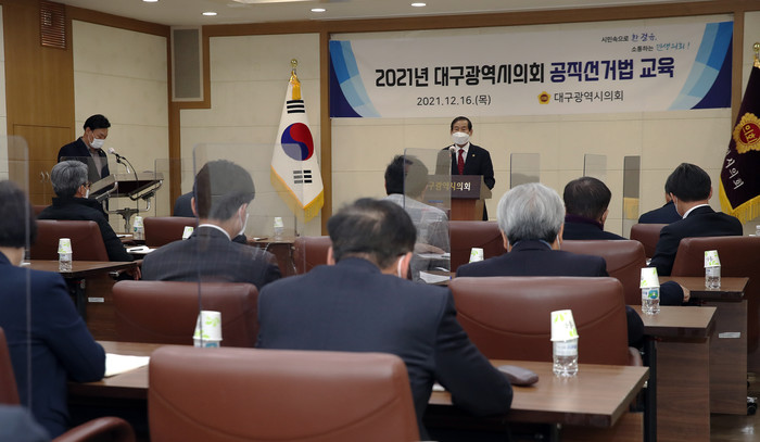 [대구=세계타임즈 한성국 기자] 대구광역시의회(의장 장상수)는 16일(목) 오후 13시30분 시의회 3층 회의실에서 내년 선거를 앞두고 대구시의원과 의회사무처 공무원을 대상으로 공직선거법 교육을 실시하였다.