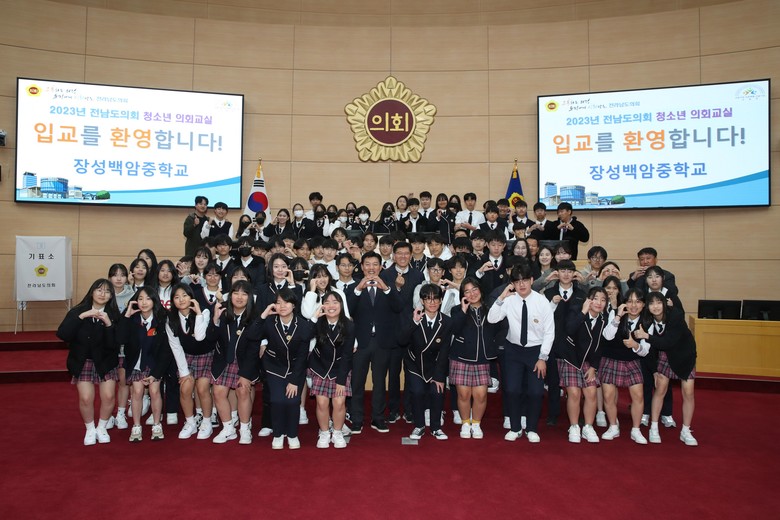 ‘청소년의회교실’은 도내 학생들이 직접 도의회를 방문하여 1일 도의원으로서 의장선거, 조례안 처리, 3분 발언 등 지방의회에 대한 이해와 민주주의를 직접 체험하는 프로그램이다. 이날은 장성백암중학교 학생 78명이 프로그램에 참여하였다.