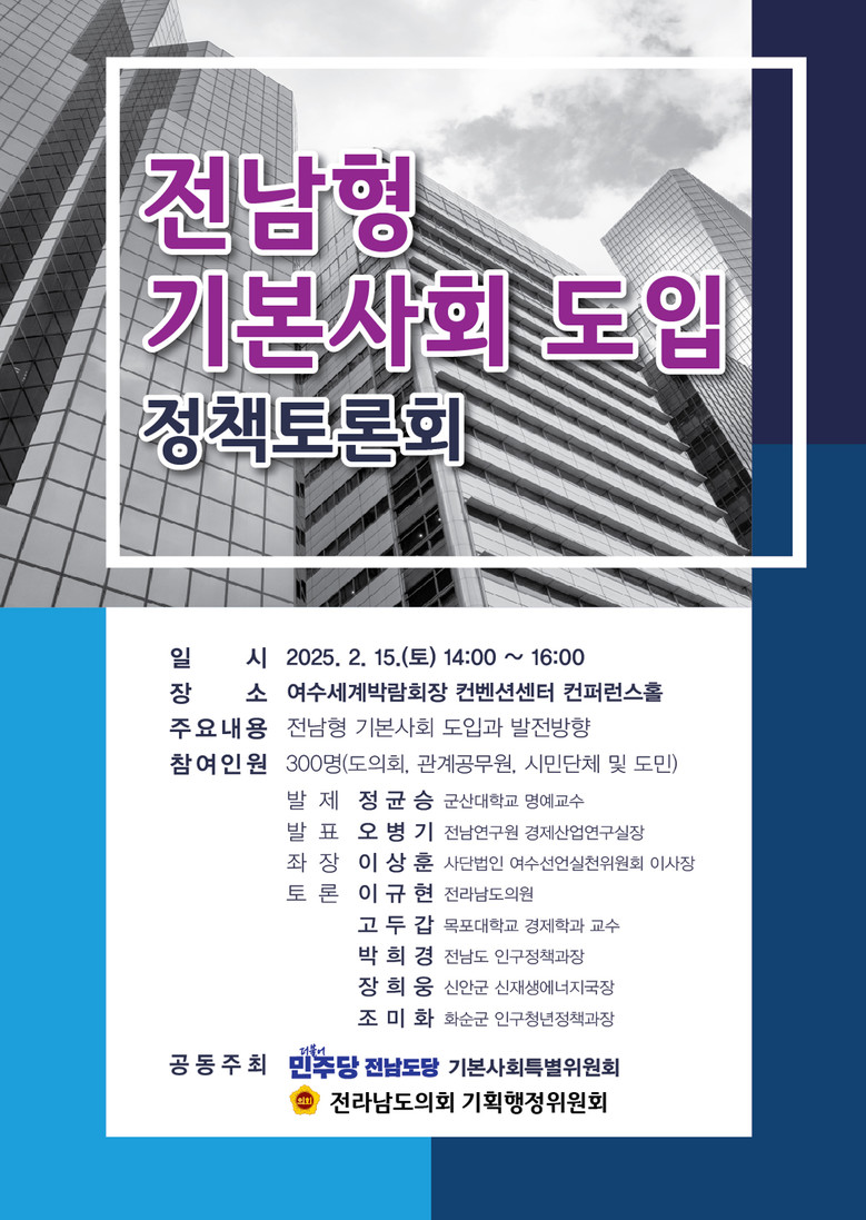 - 15일 여수세계박람회장 컨벤션센터에서, ‘전남형 기본사회 도입 정책토론회’ 개최 - [전남 세계타임즈=우덕현 기자] 전라남도의회 강문성 기획행정위원장(더불어민주당ㆍ여수3)은 2월 15일(토) 오후 2시 여수세계박람회장 컨벤션센터 컨퍼런스홀에서 ‘전남형 기본사회 도입 정책토론회’를 개최한다.