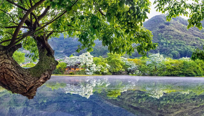 ▲ 밀양 위양못 = 저수지 가운데 5개의 작은 섬과 완재정이라는 정자가 있다. 진귀한 나무들이 즐비하고 이팝나무 꽃이 만발하는 5월이 되면 그 아름다움이 절정을 이룬다.