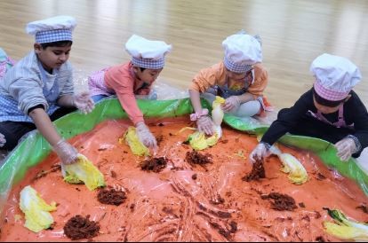 유아들은 우리나라 전통음식을 대표하는 김치의 좋은 점을 알아보고, 김치의 재료에 대해 알아본 후 절인 배추를 보고 신기해했다. 김장을 위해 들어갈 재료를 살펴보고 김치를 담그는 과정을 직접 경험해 보았다. 배춧잎 사이에 꼼꼼하게 양념을 바르며 정성스럽게 김치를 만들었다.