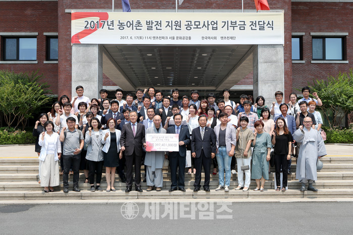 [세계타임즈 김장수 기자]한국마사회(회장 이양호)가 6월 17일(토), 경기도 과천 렛츠런파크 서울 본관 대강당에서 기부금 전달식을 진행했다. 이양호 렛츠런재단 이사장, 김학신 렛츠런재단 사무총장이 참석한 가운데, ‘렛츠런재단과 함께하는 2017년 농어촌 발전지원 공모사업’에 최종적으로 선정된 30개에게 기부금 약 4억을 전달했다.