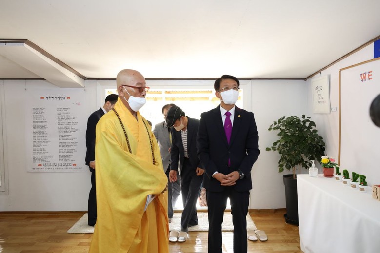 | ▲ 대원사 석의천 대종사(왼쪽)와 HWPL 전북지부 이재상 이사(오른쪽)가 전시를 관람중이다 |