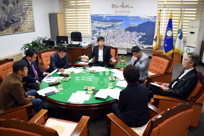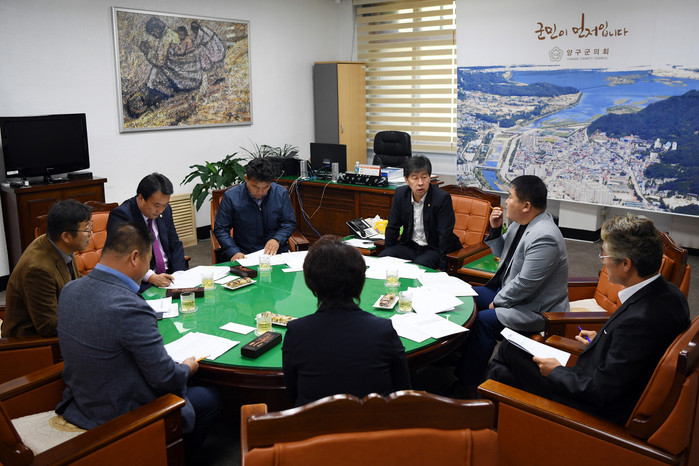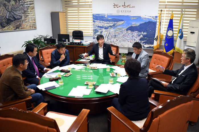 [양구군=세계타임즈 김민석 기자] 양구군의회 의원간담회가 11일 의장실에서 이상건의장, 박귀남부의장, 의원들이 참석한 가운데 열렸다.