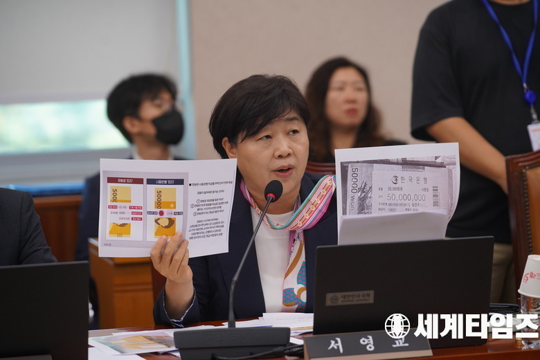 '서영교' 더불어민주당 의원이 10일 서울 여의도 국회에서 열린 법제사법위원회 전체회의에서 ‘관봉권 띠지’ 사진을 들고 발언을 하고 있다.