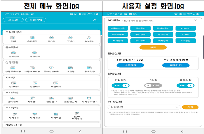 또한, 공시정보를 SNS(Facebook, Kakao Talk, Line)를 통한 공유 가능하며, 관심종목의 관심공시, 상장법인의 IR·공모일정에 대한 실시간 알림 서비스 제공하고, 공시를 조회한 후 신속하게 매매로 이어질 수 있도록 MTS 연동 기능을 제공한다.