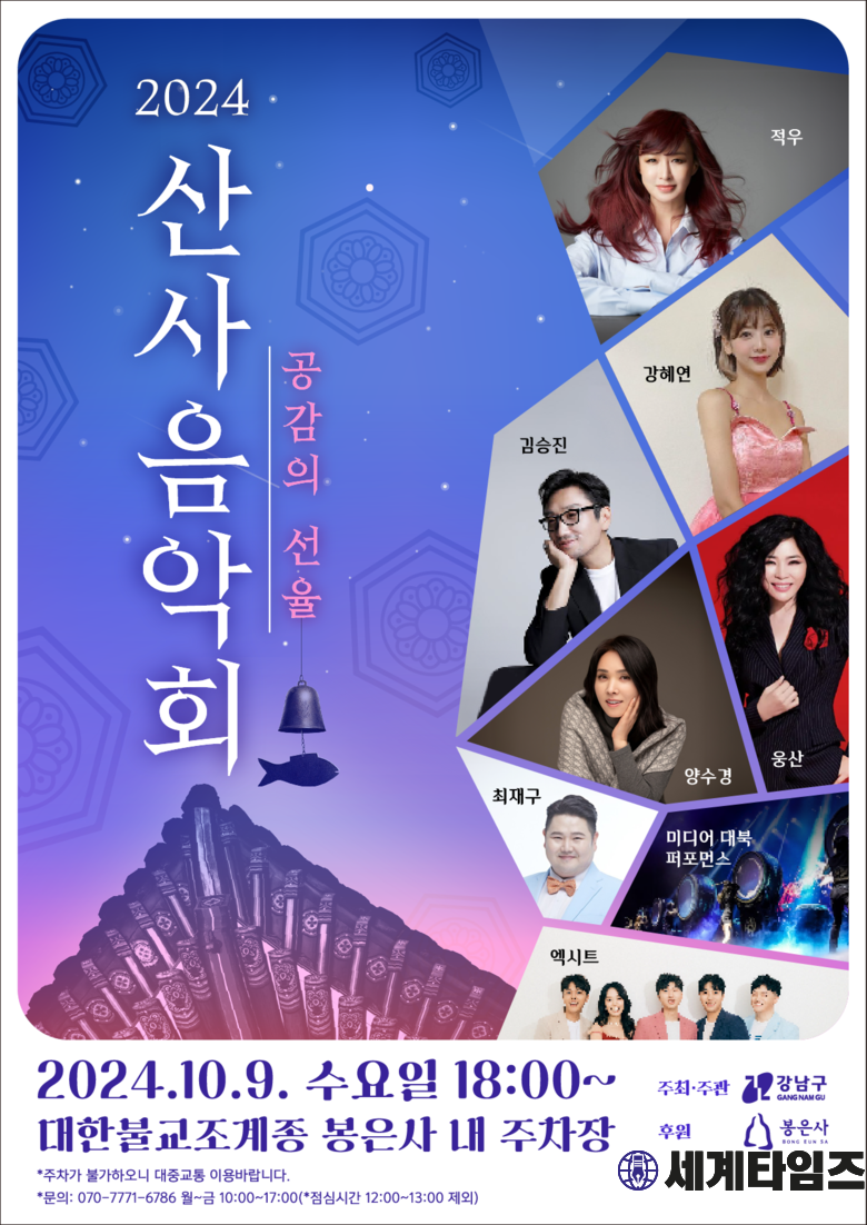 조성명 강남구청장은 “문화의 달 10월을 맞아 일상에서 잠시 벗어나 도심 속 산사음악회에서 아름다운 선율을 만끽하시길 바란다”며 “앞으로도 강남구의 전통과 문화를 살린 다양한 문화행사를 마련해 구민들에게 힐링의 기회를 제공하겠다”고 말했다.
