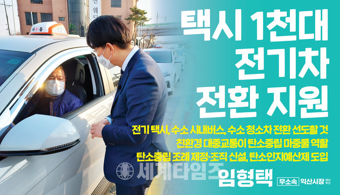 [익산=세계타임즈 이정술 기자] 임형택 익산시장 예비후보는 익산시 자체사업으로 전기 택시 1,000대, 수소 시내버스, 수소 청소차 전환을 지원하는 등 친환경 대중교통 지속 보급을 통해 탄소중립도시 기반을 조성하겠다고 발표했다.