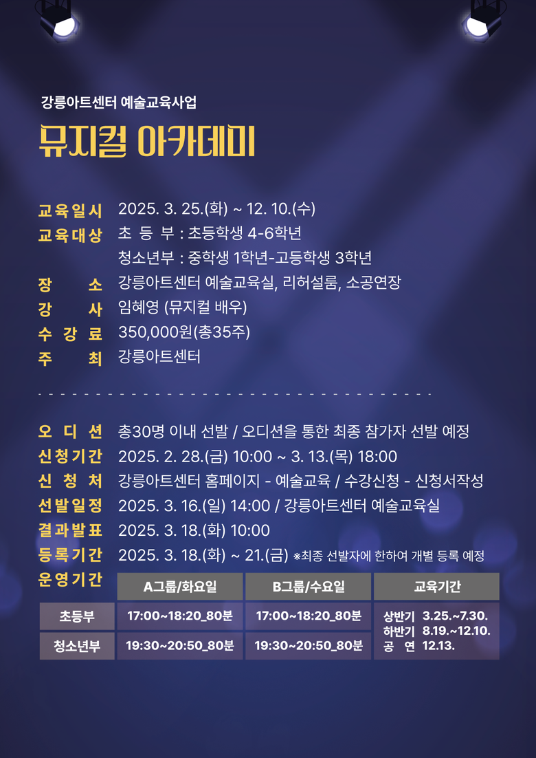 한편 강릉아트센터 뮤지컬 아카데미는 사전 오디션에 합격한 수강생을 대상으로 유료로 운영되며 프로그램 신청 및 자세한 사항은 강릉아트센터 홈페이지(gn.go.kr/artscenter/)를 참고하면 된다.