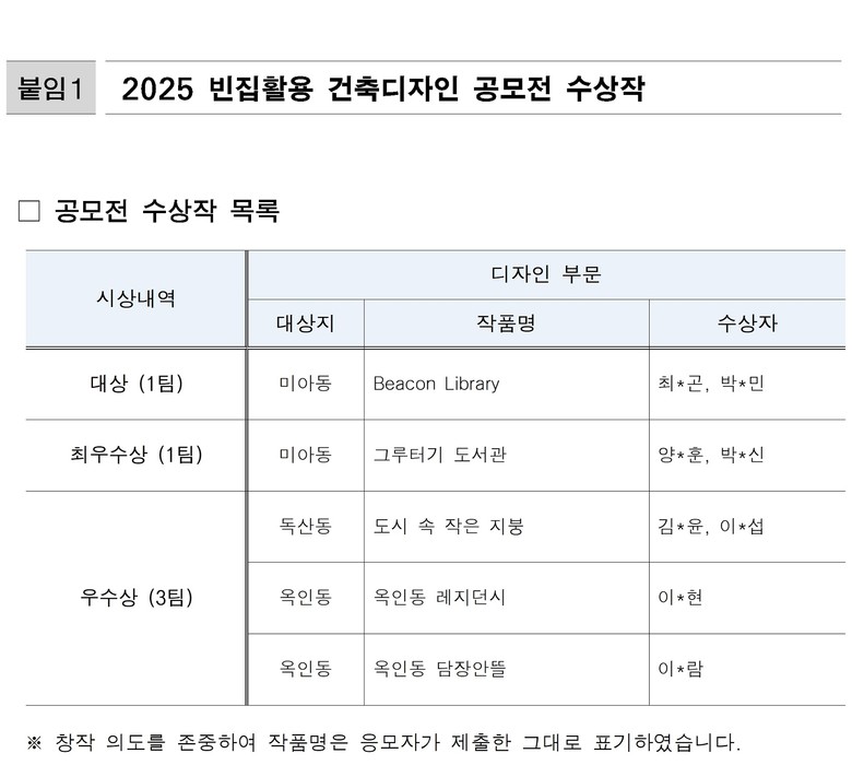 서울시는 서울주택도시개발공사(SH)와 지난 10월 20일~22일 진행한 ‘빈집활용 건축디자인 공모전’에서 5개 당선작을 선정했다고 밝혔다. 이번 공모전에는 신진건축가 17개팀, 대학생 27개팀이 참여해 44개 작품을 출품했으며, 서울시는 1·2차 심사를 거쳐 빈집을 실질적으로 활용할 수 있는 작품을 선정했다.