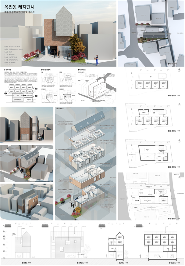우수상 옥인동 레지던시는 서촌의 다양한 갤러리가 모여 있는 예술마을의 특성을 살려 카페의 기능을 포함한 주민 편익시설로 디자인해, 작가와 주민들의 예술교육을 통해 소통을 활성화할 수 있도록 지역성과 주변 맥락을 잘 담았다.