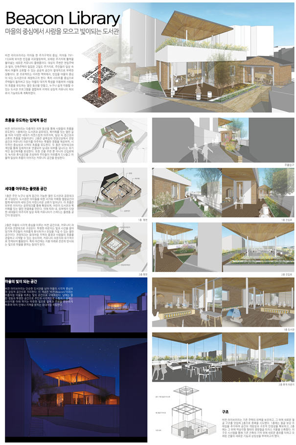 대상은 마을의 중심에서 사람을 모으고 등대처럼 빛을 비추는 공간으로 마을 도서관을 디자인한 미아동 ‘Beacon Library’가 수상했다. 최우수상은 ‘미아동 그루터기 도서관’, 우수상은 3개 작품 ▴독산동 도시 속 작은 지붕 ▴옥인동 레지던시 ▴옥인동 담장안뜰이 선정됐다.