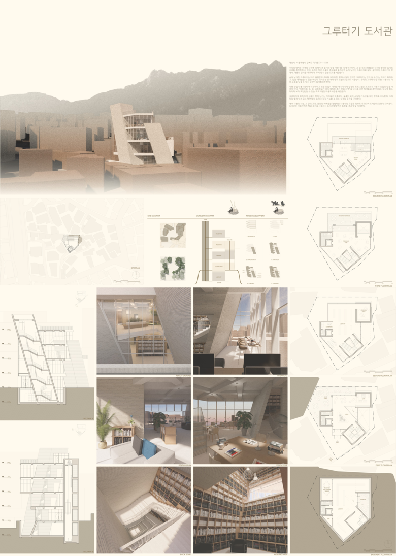 최우수상 미아동 그루터기 도서관은 그루터기에서 새로이 뻗어나가는 가지들을 직통계단 등으로 디자인해 각 층마다 내부 기능, 다양한 종류의 책벽들을 경험하는 사용자의 모습이 외부로 투과되어 도서관은 사람에게 책과 공간을, 사용자는 도서관에게 여러 표정을 주고 받도록 디자인했다.