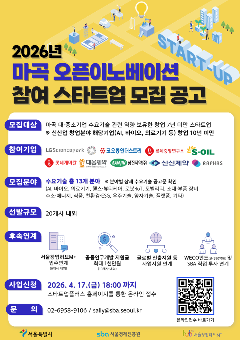 최종 선발 결과는 서면 및 대면 평가를 거쳐 7월 중 개별 안내할 예정이며, 선정된 최대 20개사에게는 매칭 기업과의 협업 기회가 제공되며, 후속지원을 통해 △ 공동 연구개발 자금지원(최대 1천만 원, 10개사), △ 서울창업허브 엠플러스(M+) 입주 기회(최대 6개사)를 제공할 계획이다.