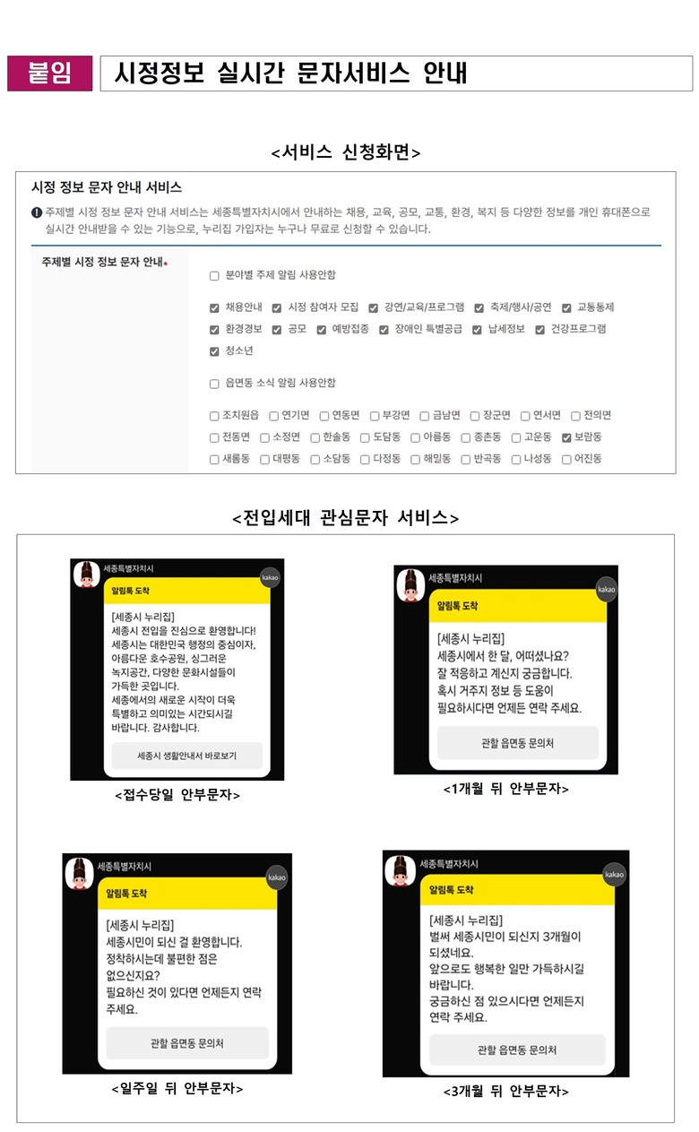 문자안내 서비스는 시 대표 누리집(www.sejong.go.kr) 회원가입 후 마이페이지 화면에서 개인별 문자안내 항목을 선택하면 받아볼 수 있다.