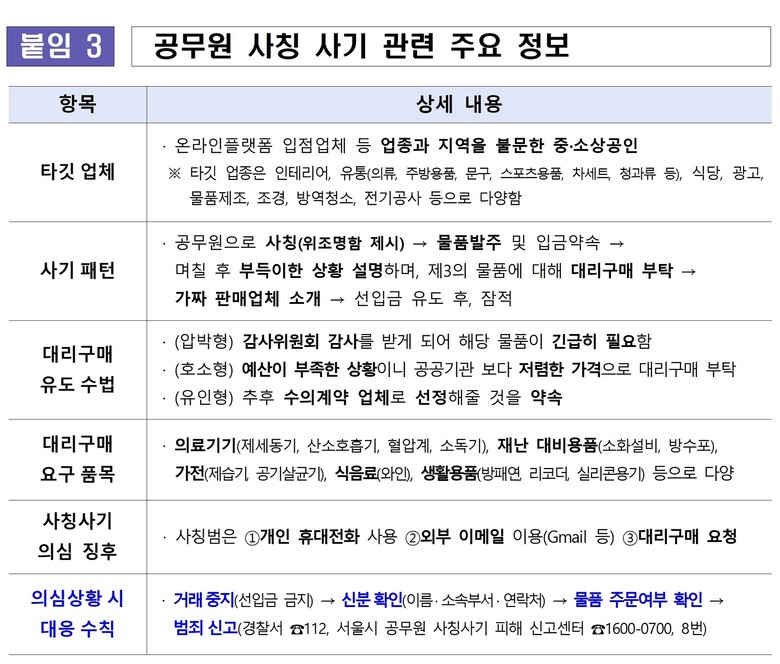 의심 상황이 발생하면 거래중지(선입금 금지) → 신분 확인(이름·소속 부서·연락처) → 실제 물품 주문 여부 확인 → 범죄 신고(경찰서 ☎112, 서울시 공무원 사칭사기 피해 신고센터 ☎1600-0700, 내선번호 8번) 등 대응 수칙을 준수해야 한다.