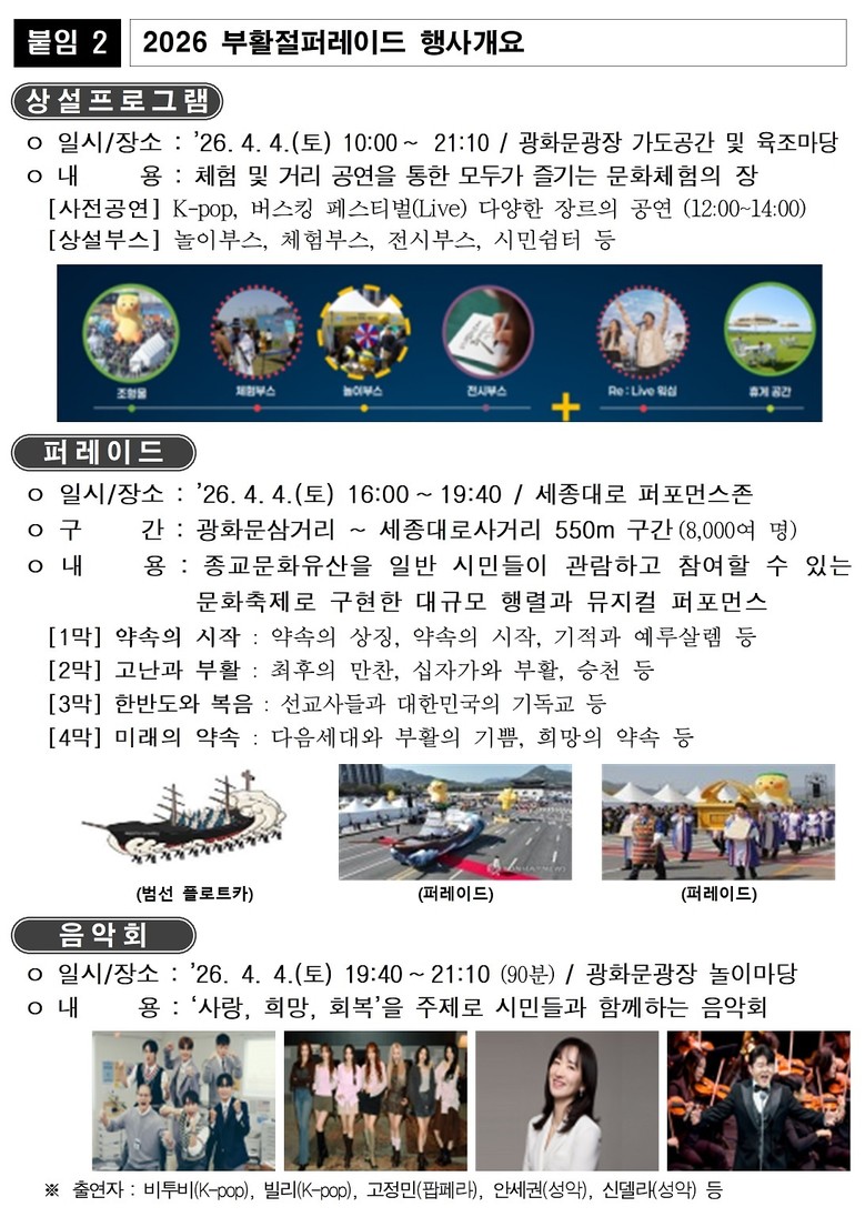 서울시와 2026 부활절 퍼레이드 조직위원회는 이날 행사에 어린이부터 노약자까지 다양한 연령층의 시민이 대규모로 참여하는 만큼, 보행 안전펜스를 설치하고 주요 지점에 안전관리요원·모범운전사를 배치하는 등 안전관리 및 교통 안내를 강화할 계획이다.