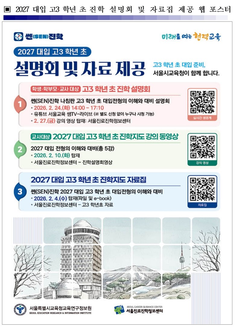 먼저, 「쎈(SEN)진학 2027 대입 고3 학년 초 자료집」을 제작·배포한다. 이 자료집에는 2026 대입 결과 분석과 2027 대입의 주요 변화, 학년 초 준비 전략이 담겨 있으며, 2월 6일(금)까지 서울 관내 고등학교에 배부된다. 또한 e-book 형태로도 제작되어 서울진로진학정보센터에 탑재되며, 교사뿐 아니라 학생과 학부모도 활용할 수 있다.