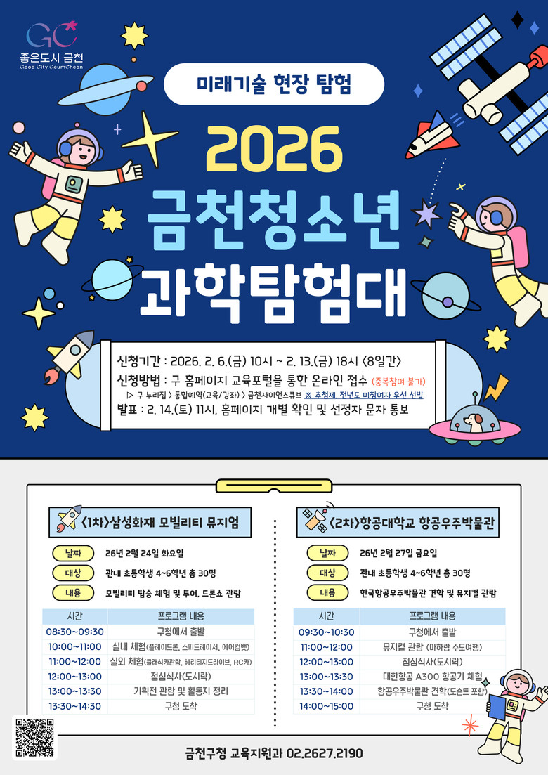 유성훈 금천구청장은 “금천 청소년 과학탐험대는 학생들이 교실을 벗어나 실제 현장에서 과학기술과 진로를 함께 경험할 수 있는 의미 있는 프로그램”이라며, “앞으로도 다양한 기관과 연계한 체험형 과학교육을 지속 확대해 미래 인재를 키우는 데 힘쓰겠다”라고 말했다.