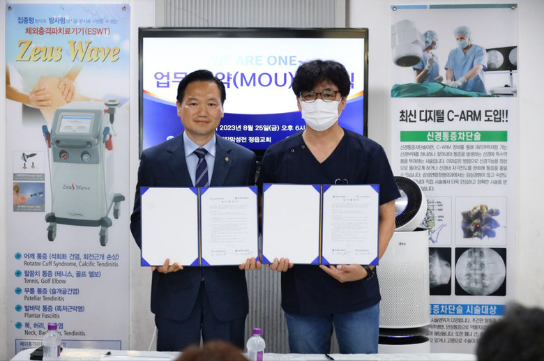 | ▲이용우 정읍교회 담임강사와 삼성연합정형외과병원 오경국 사무국장이 협약서에 서명을 하고 있다 |