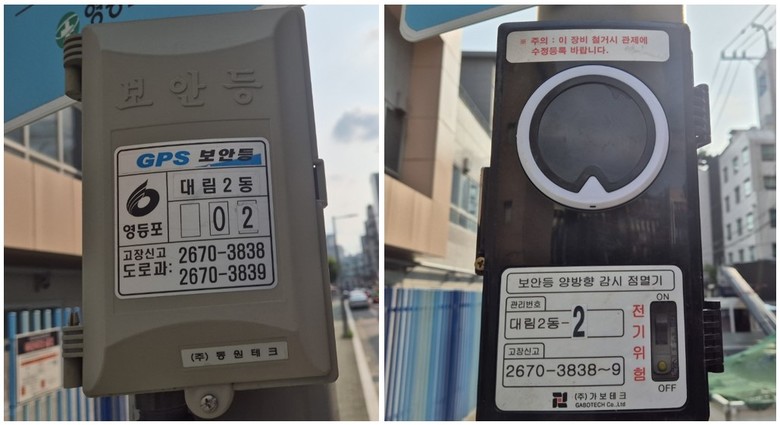 | ▲ 대림동 보안등 일반점멸기(좌-교체전), 양방향점멸기(우-교체후) |