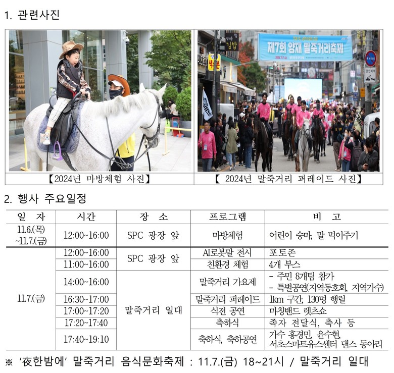이번 축제에서는 말죽거리 골목형상점가 상인회 주관으로 ‘夜한밤에 음식 문화축제’를 신설해 풍성한 먹거리와 볼거리를 더했다. 7일(금) 오후 6시부터 9시까지 노상 테이블에서 음식과 맥주를 즐기며, 말죽거리의 정취를 느낄 수 있다. 말죽거리 대표 먹거리 30선을 선뵈는 음식 플리마켓, 길거리 노래방, 버스킹, 마술쇼 등이 다채롭게 진행된다. 또, 말죽거리 상권에서 사용한 영수증을 제시하거나 현장 이벤트에 참여하면 무료 생맥주나 온누리상품권을 받을 수 있는 특별 행사도 마련됐다.