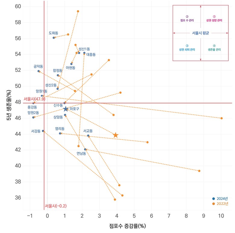 반면 서강동은 높은 임대료 부담에도 매출이 정체된 ‘수익 악화형 상권’이며, 대응 방안으로 상인 역량 강화, 집객 요인 강화 정책 등이 제안됐다.