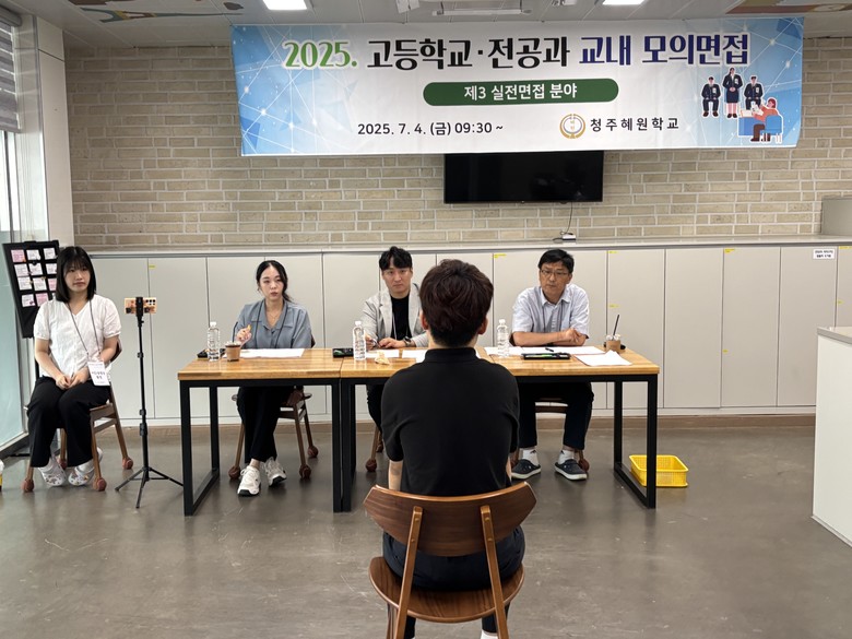 [충북 세계타임즈=이현진 기자] 청주혜원학교(교장 이영순)는 4일(금), 학생들의 직장 예절 익힘과 취업 준비에 대한 교내 분위기 조성 및 학생 맞춤형 진로 설계를 목적으로 <2025. 고등학교‧전공과 학생 교내 모의면접>을 실시했다고 밝혔다.