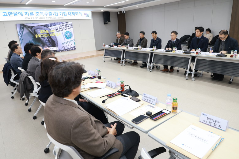 - 도, 유관기관과 ‘26년 수출지원 시책 안내 및 정부 건의로 기업 피해 최소화 추진 - [충북 세계타임즈=이현진 기자] 충북도는 8일(목) 오전 10시, 충북도의회 다목적회의실에서 KOTRA 충북지원본부, 한국무역협회 충북지역본부 등 8개 수출 유관기관들*과 충북연구원, 도내 수출입 기업** 대표 관계자 등이 참석한 가운데 ‘고환율에 따른 충북 수출.입 기업 대책회의‘를 개최했다.
