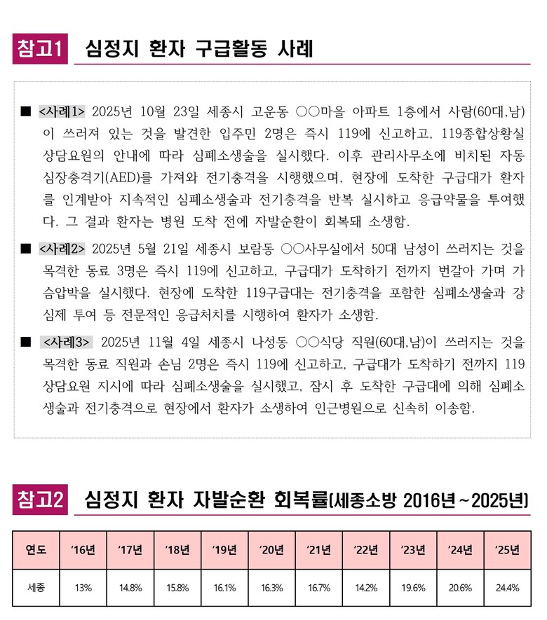특히 세종시의 심정지 환자 자발순환 회복률은 2023년 19.6%, 2024년 20.6%로 3년 연속 전국 1위로 나타났다.