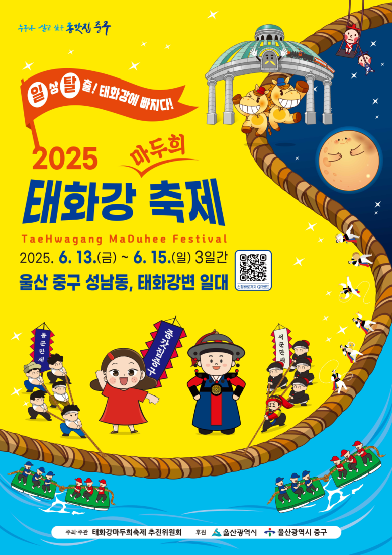 [중구 세계타임즈=이호근 기자] 지역 대표 여름 축제 ‘2025 태화강마두희축제’가 오는 6월 13일(금)부터 6월 15일(일)까지 사흘 동안 울산 중구 성남동 및 태화강변 일원에서 성대하게 펼쳐진다.