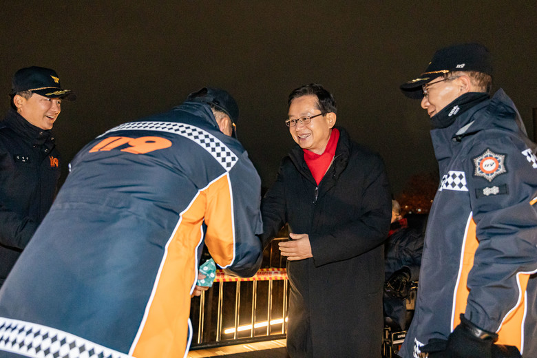 | ▲ 2025년 1월 1일 해맞이 현장(선유교)에서 현장 근무자들과 인사하는 최호권 영등포구청장 |
