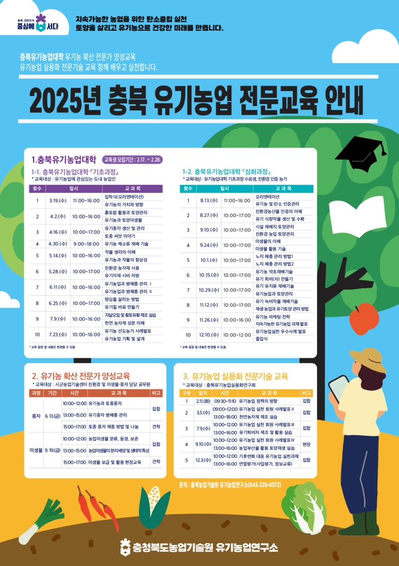 교육 신청 대상은 충북 지역에 거주하면서 유기농업을 실천하고자 하는 농업인이다. 단, 심화과정은 유기농업대학 기초과정을 이수했거나 친환경 인증을 받은 농업인을 우선 모집한다.