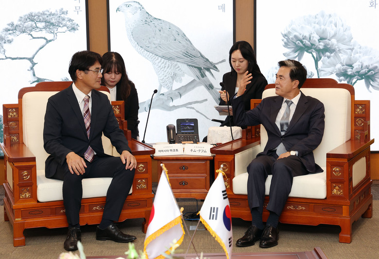 | ▲ 김태흠 충남도지사가 지난달 25일 도청 접견실에서 야마시타 마코토 일본 나라현지사를 만나 대화를 나누고 있다. |
