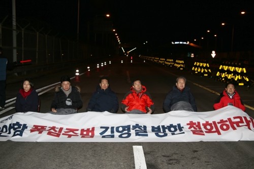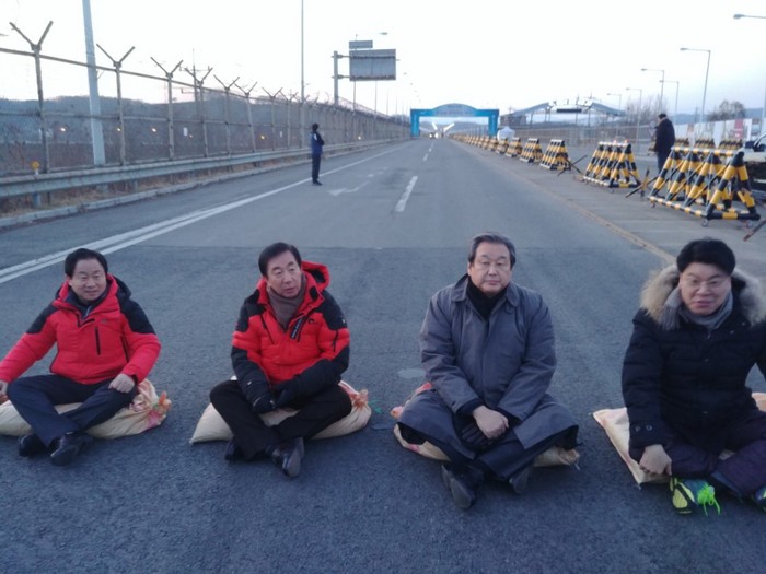 6명의 의원은 통일대교 남단에서 '천안함 폭침 주범 김영철 방한 철회하라'는 문구가 적힌 플래카드를 들고 2개 차선에 앉아 연좌 농성에 돌입했다.