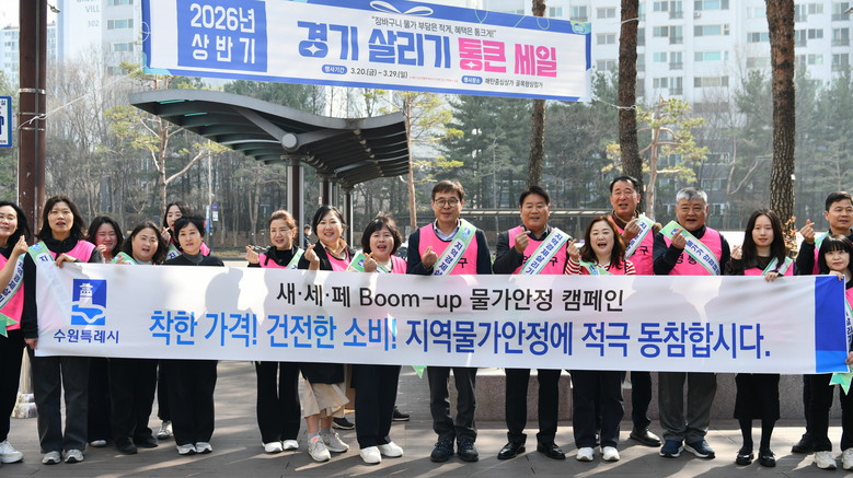 [수원시 세계타임즈=송민수 기자] 수원특례시 영통구(구청장 장수석)는 지난 26일 매탄중심상가 골목형상점가 일원에서 2026년 상반기 새빛세일페스타와 연계한 ‘Boom-up 물가안정 캠페인’을 실시했다.