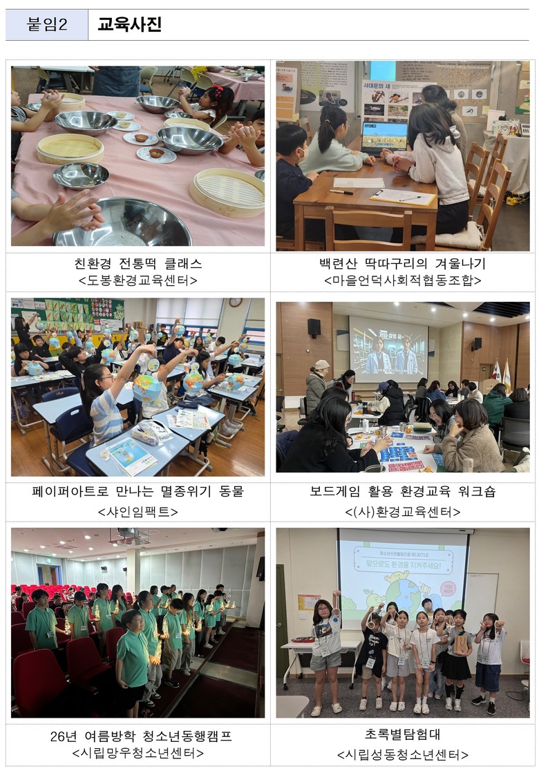 - 기후변화·생태체험·플로깅·친환경 요리 등 유아·청소년·가족·지도자 맞춤형 환경교육 진행