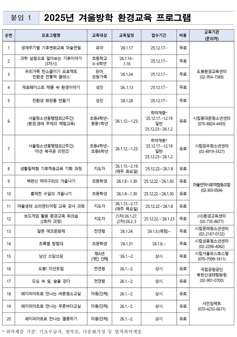 - 프로그램별 대상·기간·참가비 상이… 각 기관 및 ‘서울환경교육플랫폼’ 통해 사전 확인 필요 [서울 세계타임즈=이장성 기자] 서울시는 겨울방학을 맞아 서울시 기초환경교육센터를 비롯해 청소년센터, 사회환경교육기관 등 10개 기관에서 다양한 환경교육 프로그램을 운영한다. 유아~성인까지 연령대별 교육에서부터 가족 단위.지도자 양성 과정과 같은 특성별 교육 등이 마련된다.