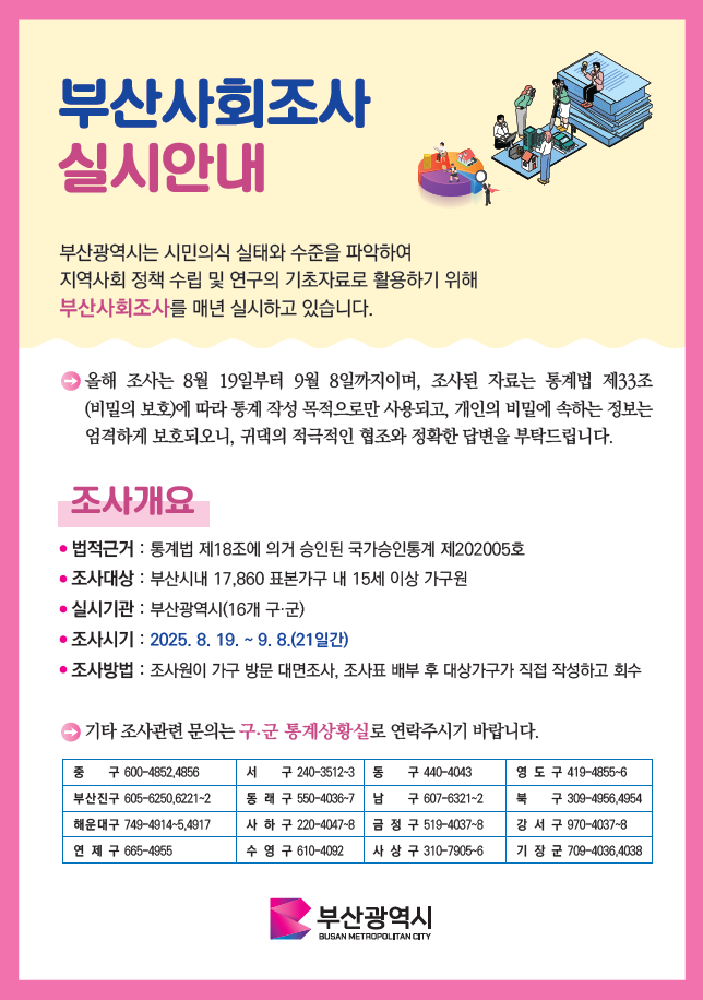 정나영 시 미래기술전략국장은 “이번 조사를 통해 수집되는 모든 의견은 향후 노동, 주거, 교통, 교육 등 다양한 분야의 정책과 서비스 개선에 적극적으로 반영할 예정으로 부산의 미래를 설계하는 소중한 밑거름이 될 것”이라며, “조사원 방문 시 적극적인 참여와 협조를 부탁드린다”라고 전했다.