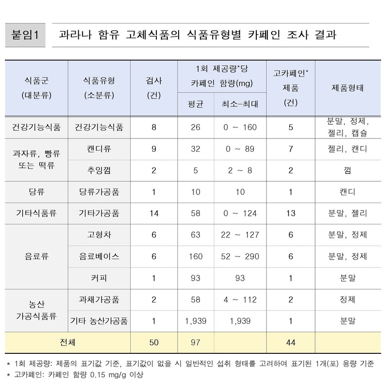 - 제도 시행을 앞두고 젤리, 껌, 타먹는 에너지 음료 등 유통 식품 50건 카페인 함량 조사