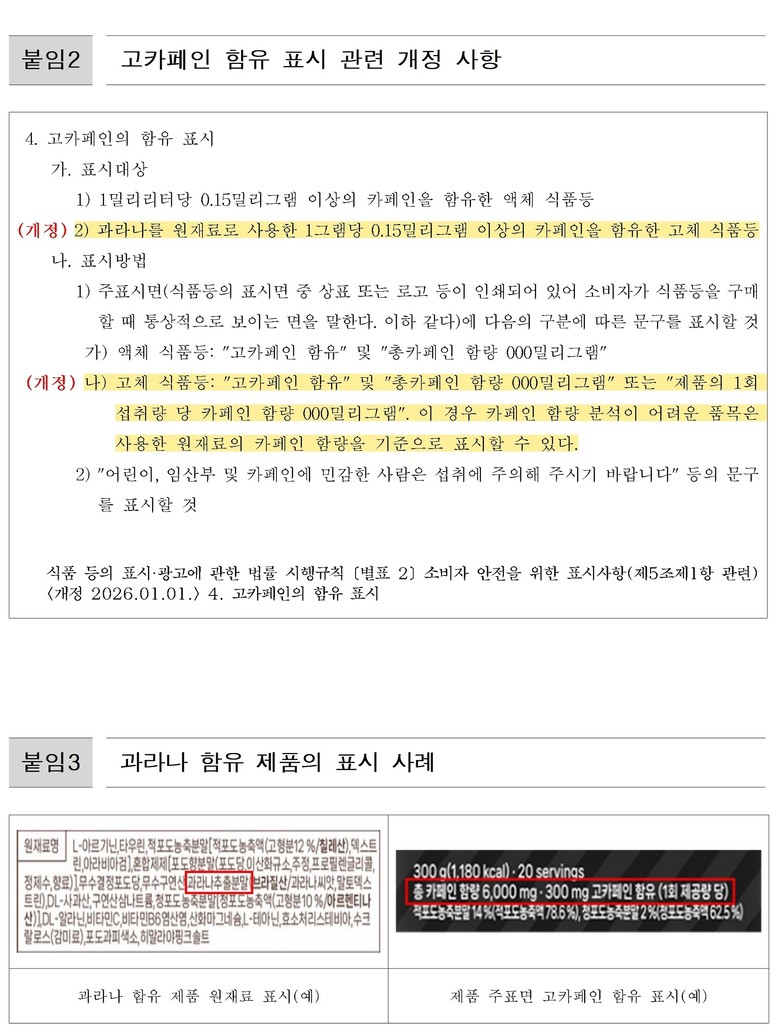 * 고카페인 함유 표시 대상 확대(시행일: 2026.01.01.): (기존) 1밀리리터당 0.15밀리그램 이상의 카페인을 함유한 액체 식품 등 (확대) 과라나를 원재료로 사용하여 1그램당 0.15밀리그램 이상의 카페인을 함유한 고체 식품(캔디류 및 젤리, 추잉껌, 초콜릿, 기타 가공식품(스낵, 에너지바 등)) 등으로 확대 * 과라나(Paullinia cupana): 브라질 아마존 지역에서 자라는 식물로, 씨앗(20~80mg/g)에 커피콩(10~30mg/g)보다 2~4배 높은 카페인이 함유되어 활력 증진 및 피로회복을 목적으로 다양한 제품에 사용되고 있음 |