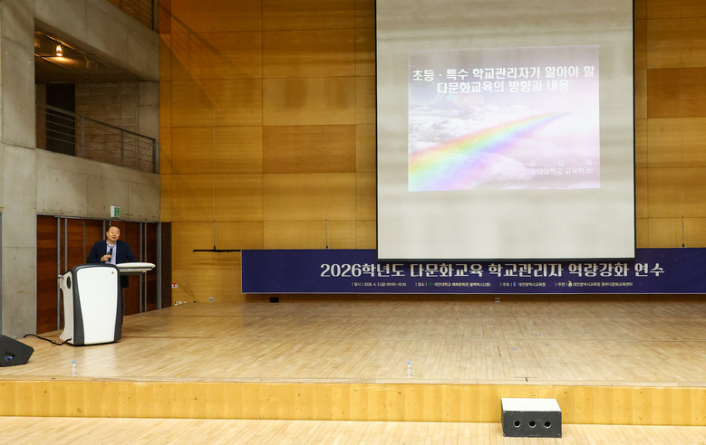 [대전 세계타임즈=이채봉 기자] 대전시교육청은 4월 3일 대전대학교 혜화문화관 블랙박스홀에서 관내 초·중·고·특수학교장 300여 명을 대상으로 ‘2026학년도 다문화 교육 학교 관리자 역량 강화 연수’를 실시했다고 밝혔다.