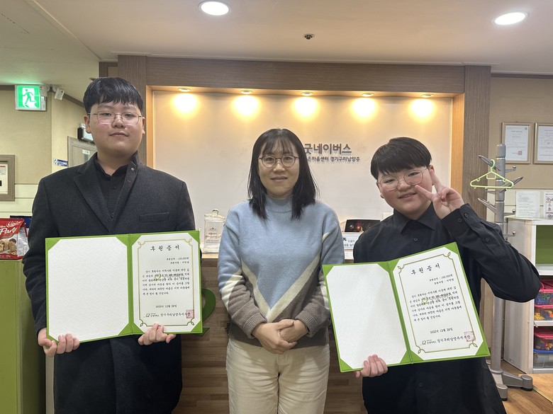 작년 11월 개최된 제 3회 해양과학 빅데이터 경진대회에서 심석중 1학년 이한솔은 데이터 시각화 부분 중등부 장려상 및 인기상을 수상하였고 심석초 6학년 이한빛은 데이터 시각화 부분 초등부 우수상을 수상하여 각각 장학금을 지급받았다. 지난 12월 27일(수), 이한솔, 이한빛 아동은 굿네이버스 경기구리남양주지부를 방문하여 지역사회 위기가정 아동을 위한 장학금 20만 원을 후원하였다.