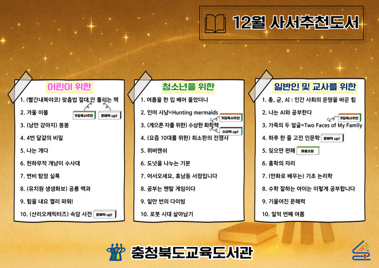 [충북 세계타임즈=이현진 기자] 충청북도교육청 직속기관 교육도서관(관장 이상래)은 <2025년 우리가 사랑한 책들(마무리)>을 주제로 2025년 언제나 책봄 열두달 북큐레이션 12월 사서추천도서 30권을 선정했다.