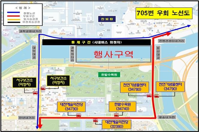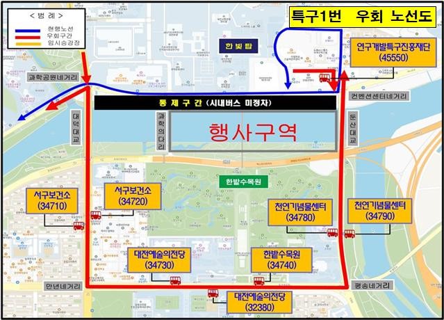 우회 운행은 오후 4시부터 9시까지 적용되며, 대상 노선은 121·705·707·911번과 급행3·특구1번이다. 이들 노선은 행사 시간 동안 기존 동선을 벗어나 대덕대로–둔산대로–유등로를 경유한다.