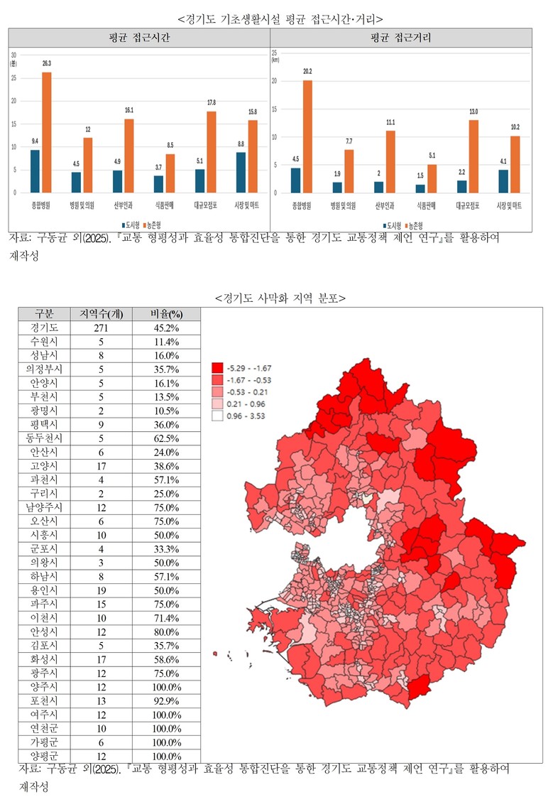경기연구원이 발표한 ‘우리 동네가 사막이 되어간다’ 보고서에 따르면, 경기도 내 농촌지역의 무려 99%가 이러한 사막화 지역에 해당한다. 도시 지역의 사막화 비율이 31%인 것과 비교하면 매우 심각한 수준이다. 실제로 농촌지역 주민이 종합병원 한 곳을 이용하려면 도시보다 약 11배나 넓은 면적을 이동해야 하며, 마트 등 대규모 점포는 13배 더 넓은 지역을 뒤져야 찾을 수 있다. 단순히 시설이 부족한 것을 넘어, 병원이나 마트에 가는 데 걸리는 시간은 도시보다 2~3배, 이동 거리는 최대 6배 이상 길어지며 주민들의 삶을 압박하고 있다.