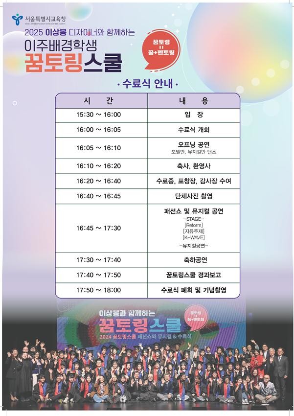 12월 20일에 열리는 수료식에서는 패션디자인반 학생들이 직접 제작한 의상을 패션모델반 학생들이 런웨이에서 선보이고, 뮤지컬반 학생들은 합창과 공연을 통해 그간의 학습 성과를 발표할 예정이다. 특히 정근식 교육감이 학생들과 호흡하는 ‘깜짝 무대’가 예정되어 있으며, 주요국 대사 등 다국적 인사들이 참석해 국경을 초월한 응원의 메시지를 전할 예정이다.
