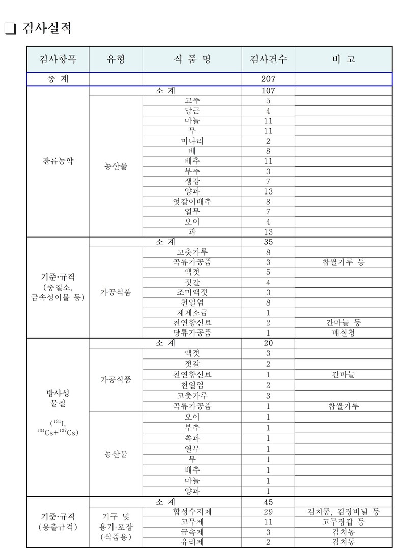 - 배추, 무, 액젓, 김치통 등 검사 대상 207건 모두 적합